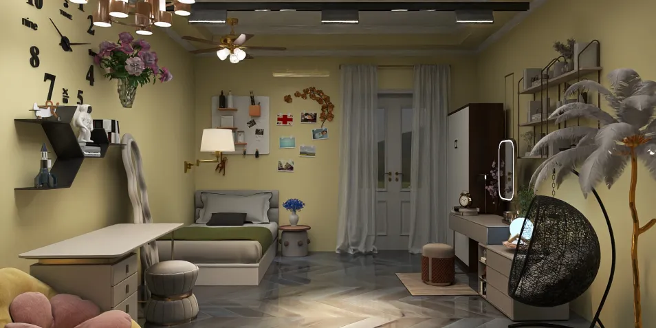 This room is decorated in a very soft and lively rhythm. A calm shade of yellow has been used as the main color, which makes every corner of the room warm, pleasant and lively. A comfortable single bed and a beautiful study table have been placed in the center of the room, which create an ideal environment for personal work, focused study and spending time alone. A stylish and functional wardrobe has been added to the right, which helps to keep all the necessary things tidy. The work table, lamp, and small plants have added life to the atmosphere of the room.