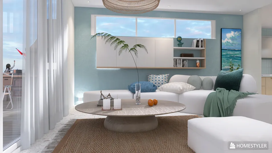 The goal of this room refresh was to get this holiday apartment by the coast ready for the summer season rental market. A fresh new color scheme of shades of white and aqua was paired with the bleached wood to get the summery driftwood look of the ocean. Upstairs a spacious master suite, downstairs an extra sleeping couch with a shower room nearby. Also ample living spaces both outdoors and indoors on both floors. The furniture was chosen to be multi purpose as to maximize the accommodation of guests. The location is on the beach. Happy holidays!