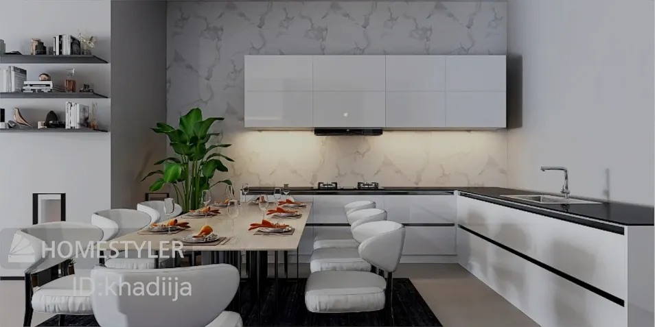 تتجلى الأناقة في هذا المطبخ الأبيض اللامع، حيث يلتقي البساطة مع الفخامة. الأثاث الأنيق ينشر دفءً بين الأضواء الخافتة، بينما تعكس الأسطح اللامعة روح العصرية. هنا، كل تفصيل يحكي قصة، لكن هل هي حكاية من الفرح أم من الوحدة؟