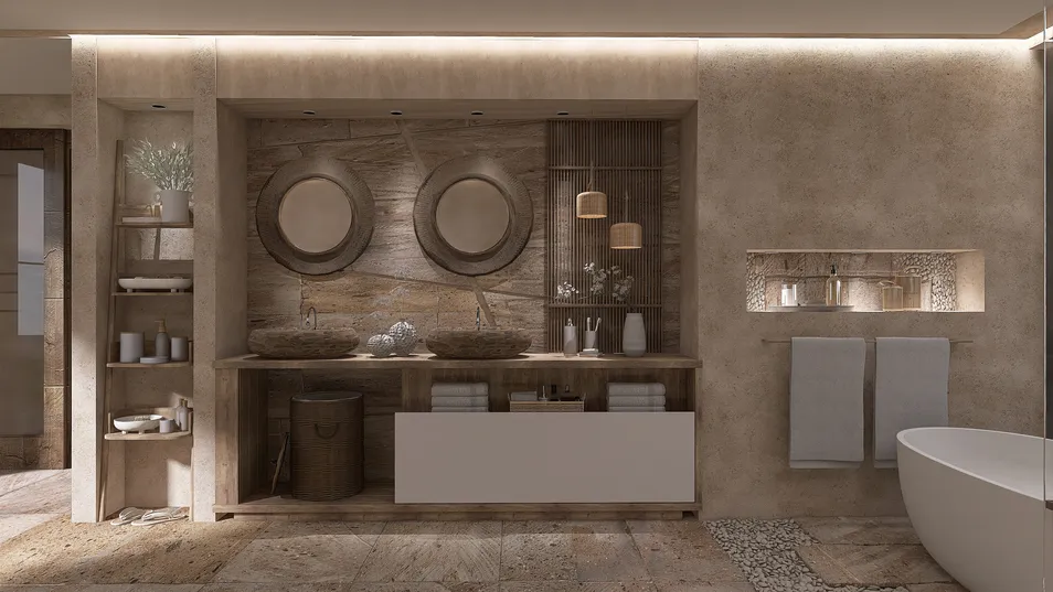 This space is not just a bathroom, it’s a meditative pause where every element is chosen for its authentic simplicity. The neutral light tones establish a cozy and essential Zen mood. The imperfection of natural materials like raw wood and unpolished stone adds warmth and a relaxing vibe.