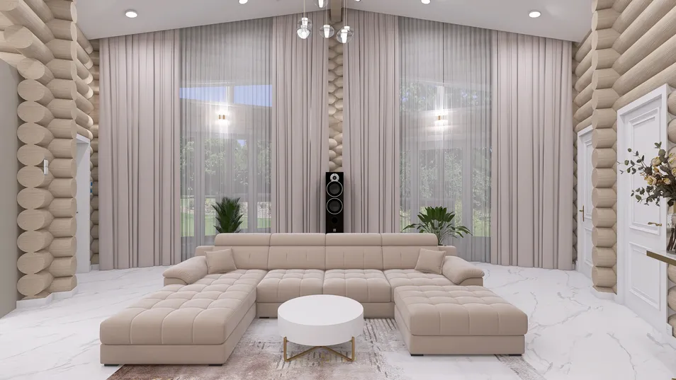 Применив в доме из бруса-кругляка современные отделочные материалы, предметы мебели и декора получилось уйти от эффекта "русской избы"