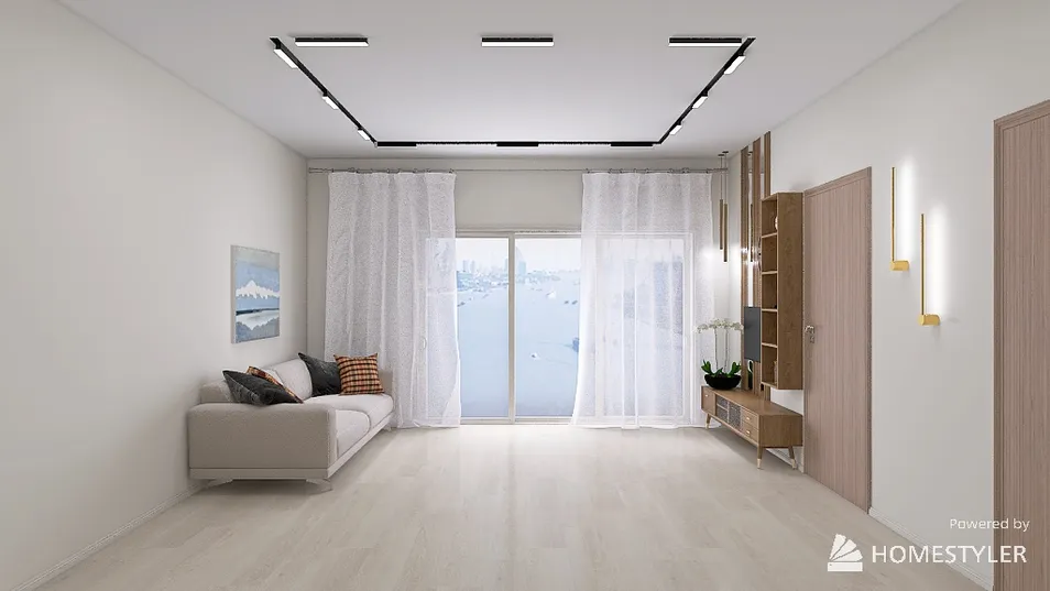 Гостиная, где свет нежно касается белых стен, а воздух напоён свежестью. Уютный диван приглашает к отдыху, а окна открывают вид на бескрайние горизонты, где мечты и реальность переплетаются в тонком танце.