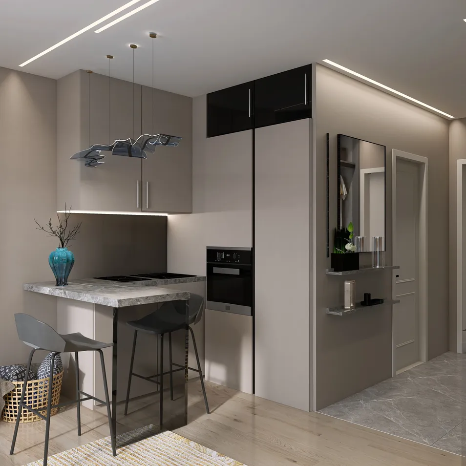 Эта функциональная студия в современном стиле, оформленная в светлых оттенках, излучает уют и стиль. Многоуровневое освещение добавляет глубину пространству, создавая атмосферу, где каждая деталь служит для комфорта и вдохновения.
