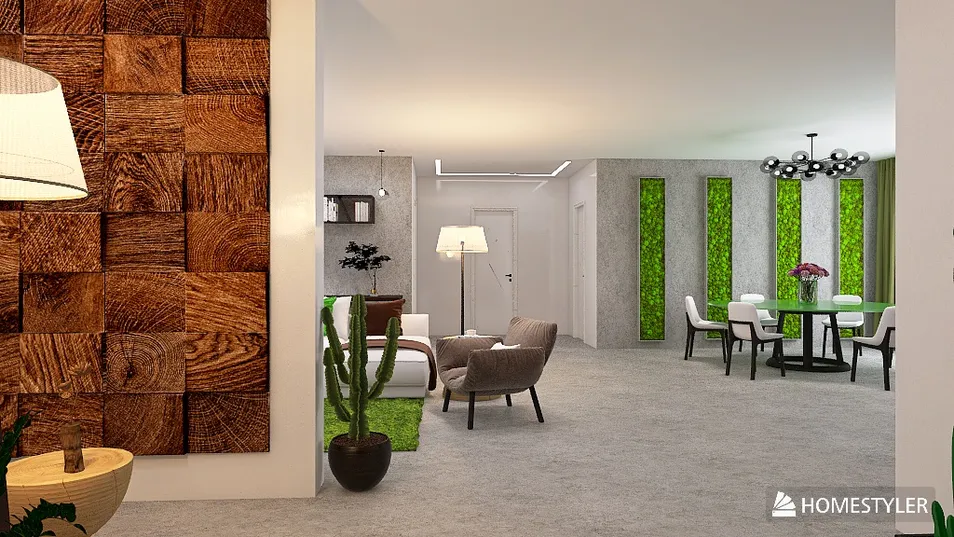 Открытое пространство: кухня, столовая, гостиная, рабочая зона. Тематика - камень, дерево, немного металла и стекла, природные цвета.