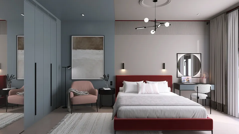 Элегантная спальня в современном стиле для молодой амбициозной девушки с большими панорамными окнами, продуманным функционалом и эстетикой.