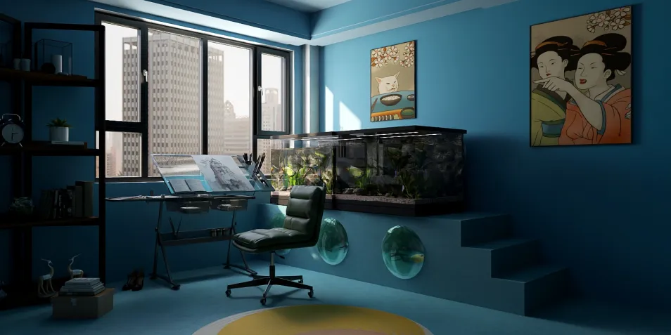 Рабочий кабинет выполнен в успокаивающих синих тонах, создающих атмосферу морского побережья. Центральным элементом кабинета является большой аквариум, который не только привлекает внимание, но и создает расслабляющую атмосферу. В аквариуме плавают яркие рыбы, а на дне расположены камни и растения, имитирующие морское дно. Мягкое освещение аквариума подчеркивает его красоту и создает эффект подводного мира.