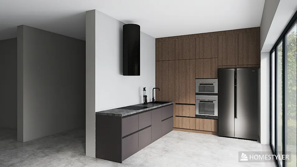 Эта кухня сочетает в себе минимализм и функциональность. Гладкие линии, тёмные оттенки и естественный свет создают атмосферу уюта. Идеальное место для кулинарных экспериментов и встреч с друзьями.