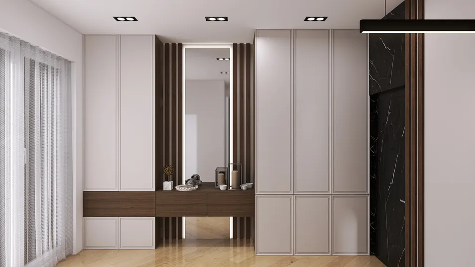 Стильная современная светлая прихожая с многофункциональными местами для хранения и большим зеркалом с подсветкой создает ощущение простора. Теплые оттенки дерева и минималистичный дизайн делают ее идеальным началом любого дома.