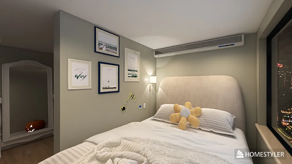 В этом пространстве сдержанная палитра серого и теплого дерева создает атмосферу спокойствия. Мягкий свет, отражаясь от зеркала, усиливает ощущение простора, в то время как уголок с тыквой придаёт уют и намекает на осенние вечера. Искусство на стенах рассказывает о мечтах.