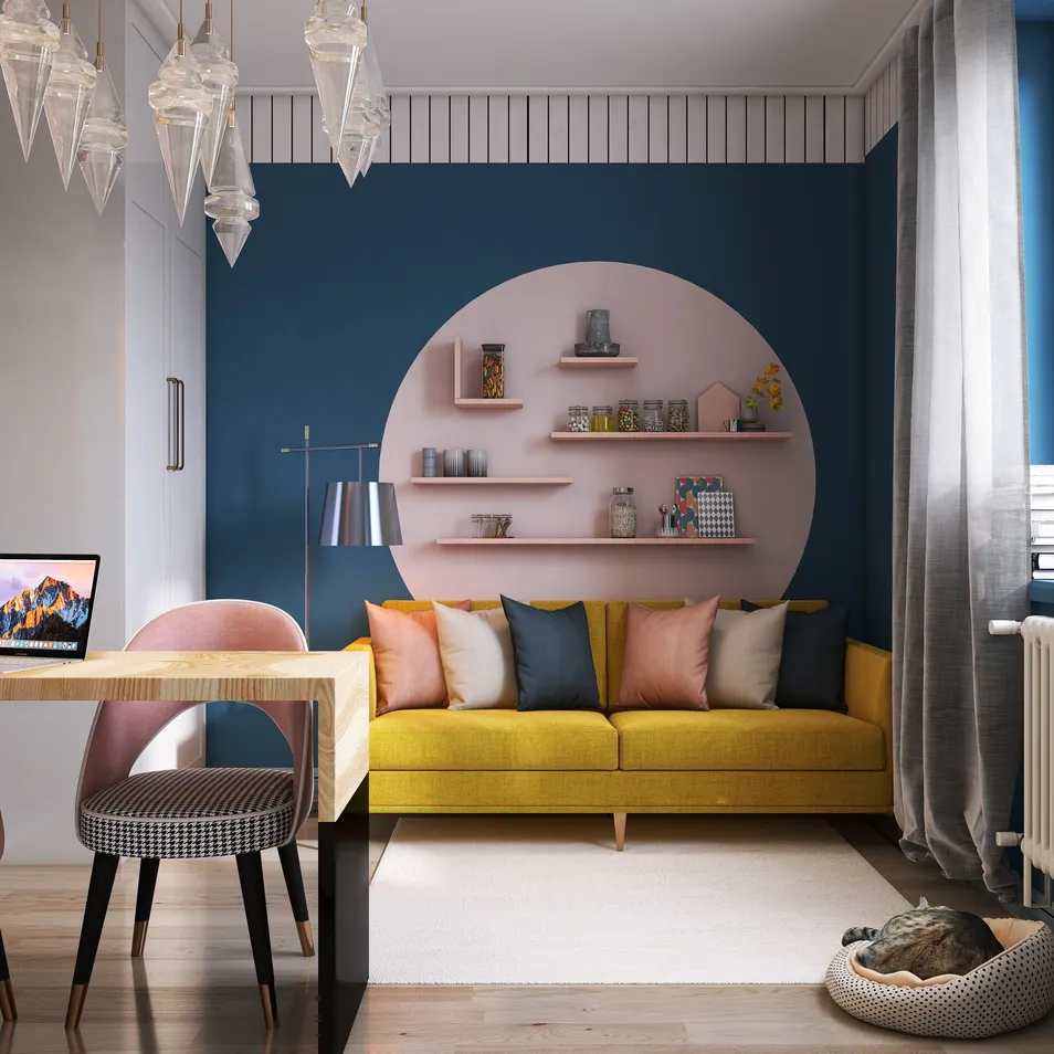 Студия с узкой прихожей, совмещенным сан. узлом и комнатой (зона кухни, обеденная зона, зона отдыха, рабочая зона, зона спальни). Мало света, поэтому бфли выбраны приятные светлые оттенки с черными и металлическими элементами. Вдохновение стилем фьюжн.