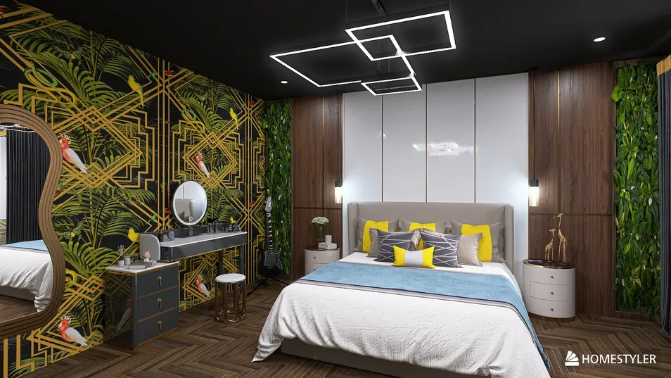 Эта спальня — ода роскоши: стены, обвиты зелеными растениями, а потолок сверкает неоновыми линиями. Ванная, словно из мраморной сказки, обещает уединение. Здесь даже тишина шепчет о комфорте, затмевая все заботы мира.
