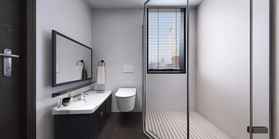 تتجلى الأناقة في كل زاوية من هذا الحمام المعاصر، حيث تتداخل الألوان الهادئة مع الأسطح النظيفة. اللمسات المعدنية تضيف بريقًا، بينما تعكس النوافذ الكبيرة جمال المدينة، لتجعل من كل لحظة هنا تجربة فريدة.