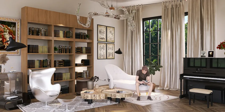 في هذا الفضاء، تتعانق العناصر بتوازن غريب؛ حيث تجتمع الألوان الدافئة مع لمسات من الخشب الطبيعي، بينما تتراقص الأضواء بين ظلال الستائر. يجلس رجل بملامح هادئة، غارقًا في صفحات كتابه، وكأن الزمن قد توقف في هذه الزاوية الساحرة.