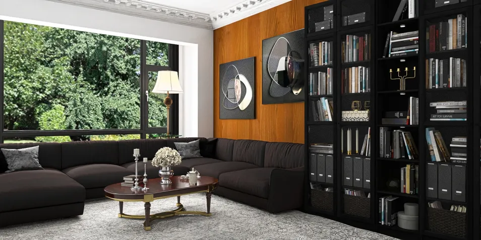 تتلاعب الألوان الداكنة مع الضوء الطبيعي، حيث تتناغم الأريكة الواسعة مع الكتب التي تروي قصصاً لم تُكتب. إن تفاصيل الزخرفة تُجسد توازنًا بين الراحة والعصرية، كأن الحياة هنا تنبض بألحانٍ غير مكتملة.