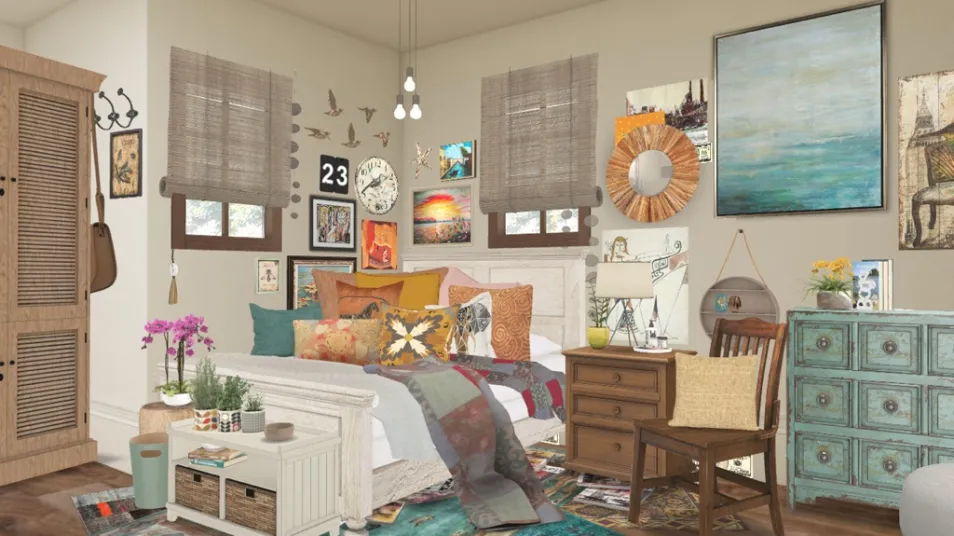 A lovely teen bedroom full of paintings & plants.Theres thrift stored storage and quilts made by her aunts.A selection of cushions full of bursts of colour,thank god she doesn’t have to share her room with her brother.