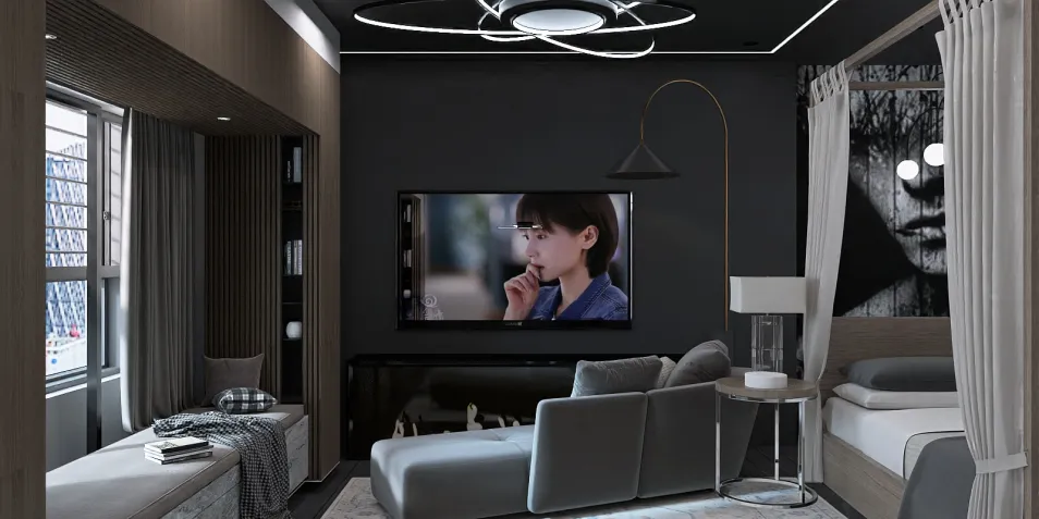 quarto no apartamento para casal ou solteiro ,com espaço de TV e lareira ,e espaço de leitura,um lindo quarto em tons pretos , muito moderno e acolhedor 🩶🖤