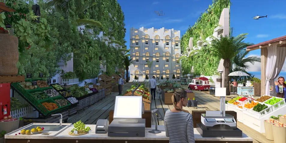 This vertical farming community holds farmers markets every first Sunday of every month! This Sunday morning is just getting started! (this is my second time doing this design! The first time it got corrupted when i went to edit an error *cries in designer*)
