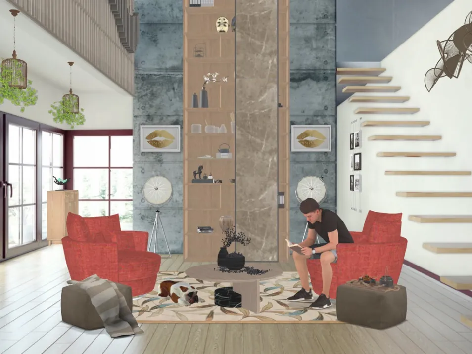 You cannot go wrong designing in balanced symmetry. The main focal point here is the wooden display cabinet running all the way through the double height bare concrete wall. What made this design look Southeast Asian? It is the use of light colored wooden material mixed with metal hardware, asian inspired earthenware and other accessories complete with furniture pieces that matches the hanged planters and antique copper finished divider wall of the upper level floor.