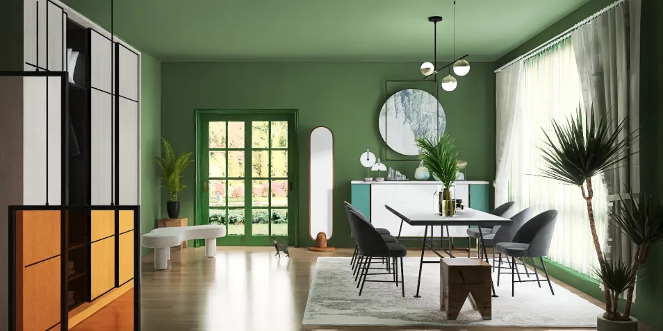In this spacious dining room with a double glass door leading up to the garden, we have a modern and fresh feel. Green is everywhere.
