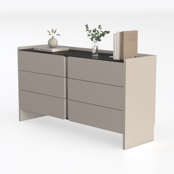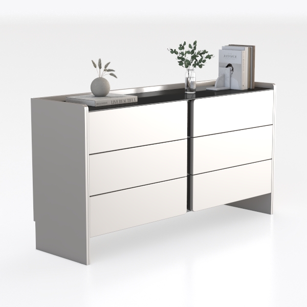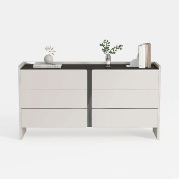 The body features a soft, matte white finish—cool to the touch, with a smooth, almost velvety texture that contrasts beautifully with the cabinet’s dark, polished top. This dark surface, likely a polished stone or high-gloss composite, catches light gently, adding depth without overwhelming the overall simplicity. The cabinet’s structure is defined by its slim, tapering legs, lifting it slightly from the floor to create an airy, uncluttered silhouette, while the six spacious drawers, with their smooth, silent glides, offer practical storage for linens, books, or daily essentials.