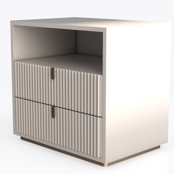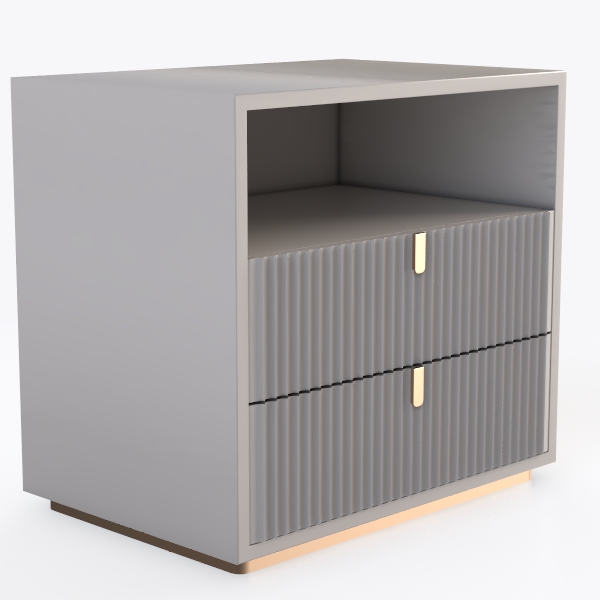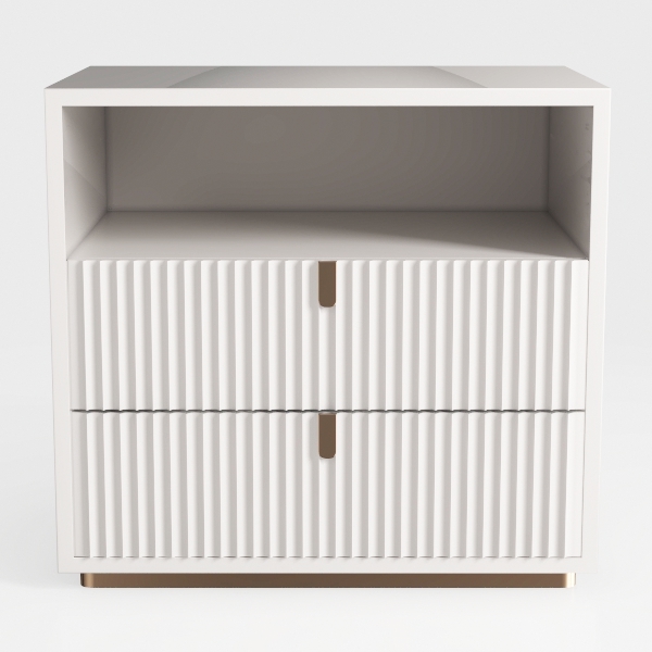 Ideal for a modern bedroom or a minimalist living room, it pairs beautifully with soft linen bed linens, a marble nightstand, or a sleek area rug, elevating spaces with a touch of quiet luxury. The vertical fluting not only adds visual interest but also creates an illusion of spaciousness, making it perfect for compact rooms. Beneath the doors lies practical storage, with enough room to tuck away essentials like bedtime books or living room remotes, while the smooth, cool-to-touch surface and lightweight yet sturdy build ensure it’s as functional as it is stylish. Every detail, from the fluted pattern to the metallic accents, comes together to craft a piece that merges modern simplicity with thoughtful design.