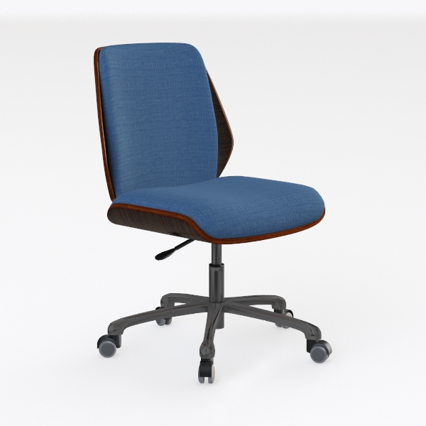 This chair takes cues from mid-century modern design, merging minimalist silhouettes with thoughtful functionality to create a piece that feels both elegant and practical. The soft, textured blue upholstery of the seat and backrest offers a tactile experience—细腻 yet durable, inviting extended periods of comfort. Warm, matte wood trim along the edges adds a touch of organic warmth, while the sleek, brushed metal base with its five-point configuration provides stable support, its cool metallic sheen balancing the softness of the fabric.