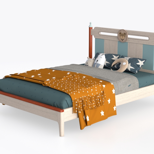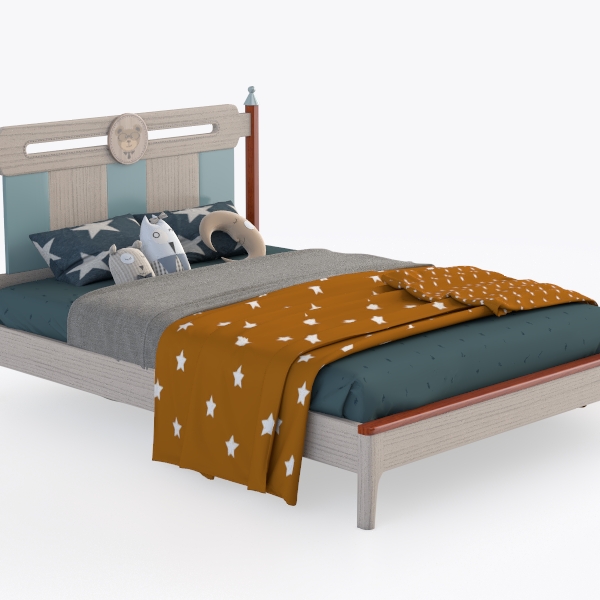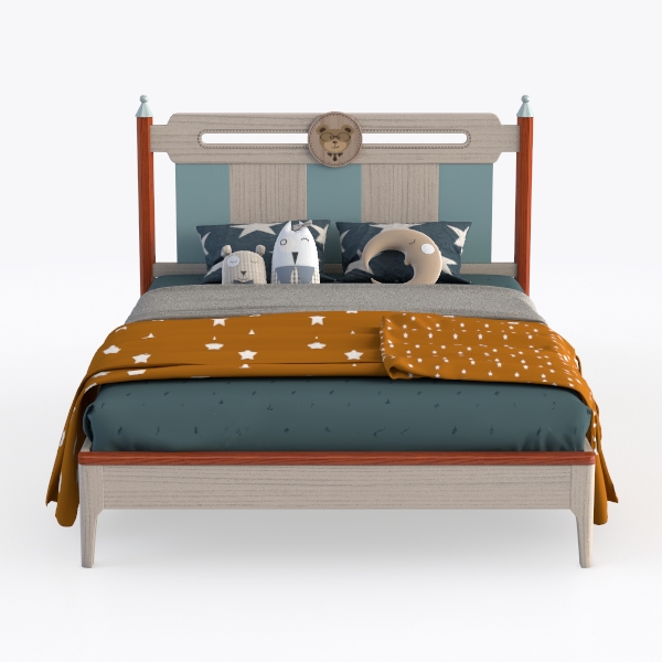Crafted with a focus on nurturing imagination, this bed draws inspiration from bedtime stories and the quiet magic of starry nights, featuring subtle nods to childhood wonder. The frame combines warm, light-toned wood with soft, muted blue upholstery on the headboard, creating a gentle contrast that feels both grounded and dreamy. Textures vary delightfully: smooth wood grains add a natural touch, while the upholstered panels invite a soft, huggable feel, complemented by playful accents like a small, stitched animal motif at the center of the headboard.