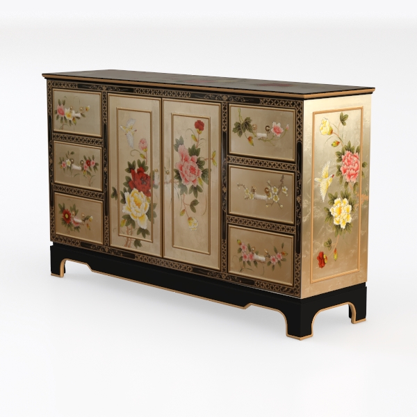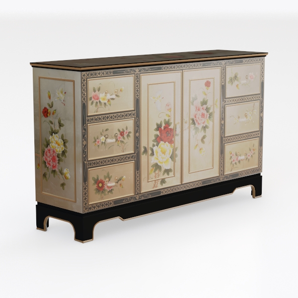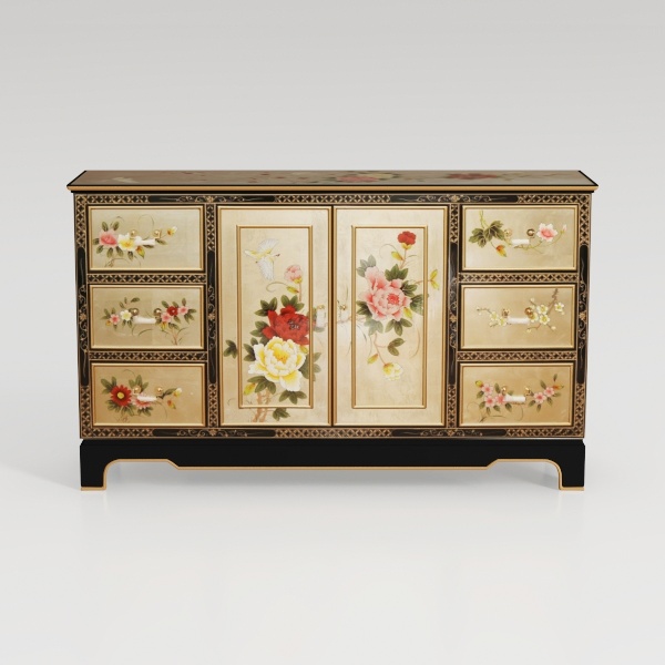 Ideal for a living room or study, this cabinet seamlessly blends with both minimalist and bohemian styles. Pair it with a sleek marble coffee table for a modern twist, or complement it with a woven rug and silk curtains to enhance its traditional allure. The functional design includes multiple drawers and two spacious cabinet doors, offering ample storage for books, decor, or daily essentials. The sturdy wooden legs provide steady support, ensuring durability, while the smooth glide of the drawers adds to its practicality. Together, these elements make it not just a storage piece, but a work of art that tells a story of heritage and refinement.