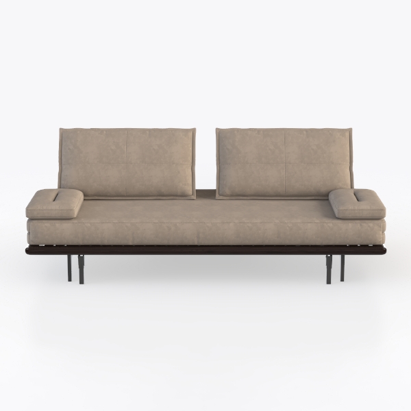 Introducing a sleek and modern sofa that embodies the essence of contemporary design. This piece draws inspiration from minimalist aesthetics, emphasizing clean lines and simplicity. The soft, taupe upholstery provides a tactile, inviting texture, enhancing comfort while maintaining an elegant appearance. The subtle quilting details on the cushions add a refined touch, making it a stylish addition to any living space.