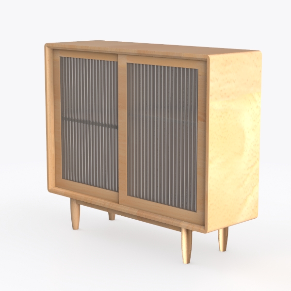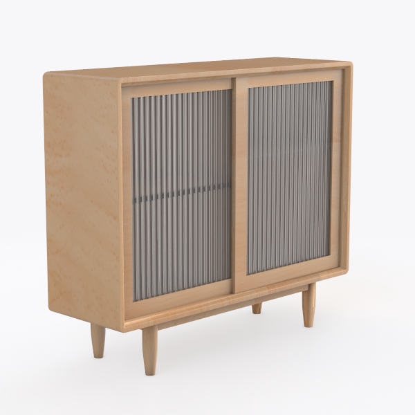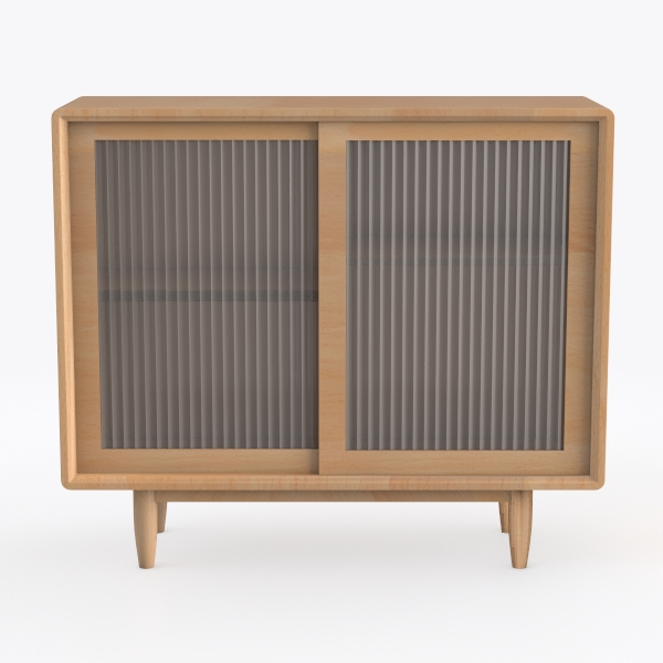 Drawing inspiration from the timeless allure of mid-century modern design and the organic warmth of natural materials, this piece embodies a blend of simplicity and character. The frame, crafted from light-toned wood with soft, visible grain patterns, exudes a tactile richness—smooth to the touch and inviting to the hand, as if it has been shaped by the gentle passage of time. Its sliding doors, adorned with vertical ribbed panels in a muted, textured finish, create a rhythmic visual flow, catching and diffusing light to cast subtle, shifting shadows that add depth and life to the space.