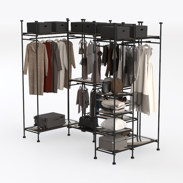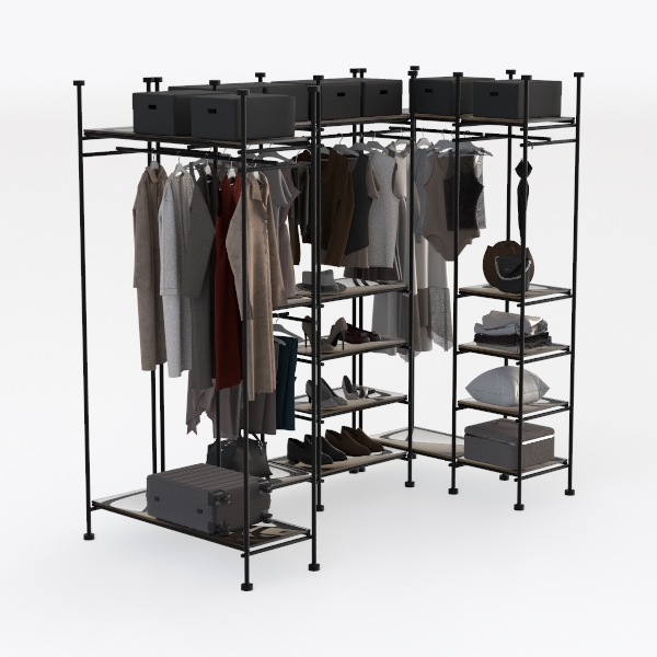 Visually, the matte black metal frame, with its slender, unadorned bars, creates a sleek, contemporary silhouette that feels both sturdy and light. The open structure, paired with smooth wooden shelves and polished metal hangers, allows for easy visibility of neatly arranged items: soft-textured sweaters, crisp tailored coats, and structured leather bags hang alongside stacked accessories, while rows of shoes and folded linens occupy the lower shelves. The contrast between the cool metal frame and the warm, varied textures of the fabrics adds depth, making the space feel intentional rather than rigid.