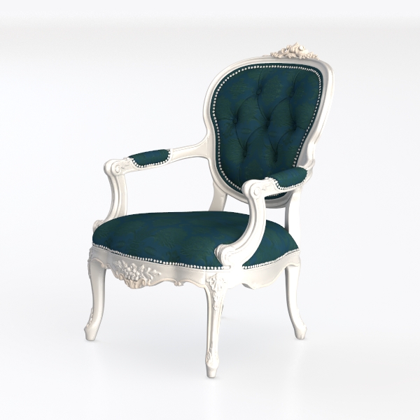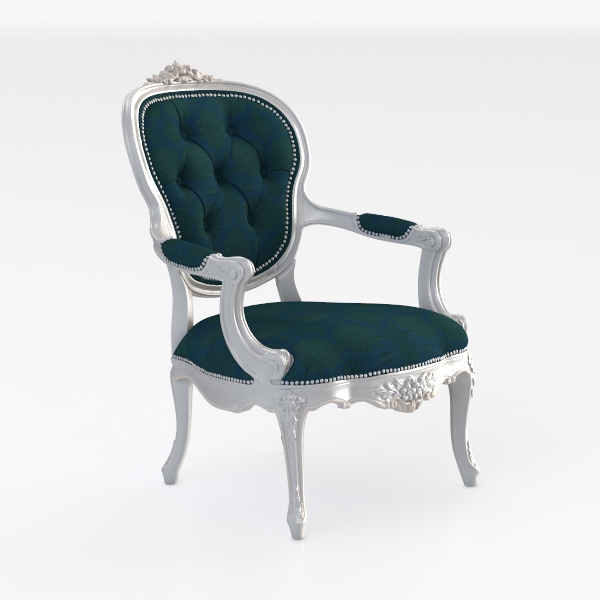 Inspired by the ornate craftsmanship of 18th-century European salons, this armchair merges classical grandeur with a touch of modern sophistication. The deep forest-green upholstery, crafted from sumptuous velvet, feels incredibly soft and plush to the touch, its subtle tufted pattern adding gentle texture that catches light beautifully. Contrasting this rich fabric is a delicate, silver-leafed wooden frame, polished to a warm, metallic sheen. Intricate floral and scroll carvings adorn the arms and legs, blending artistry with structural grace, while the curved back and gently sloped arms create a welcoming, embrace-like silhouette.