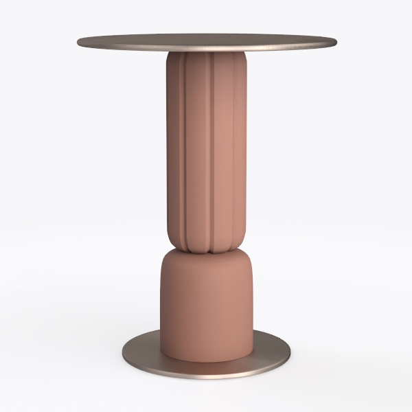 Visually, the base features a muted blush finish with a smooth, matte texture that feels warm and tactile, while the contrasting polished metal top adds a subtle sheen, creating a gentle play of light and shadow across its surface. Vertical ridges along the stem introduce dynamic depth, making the piece feel both grounded and visually engaging, avoiding the monotony of plain, unadorned forms.