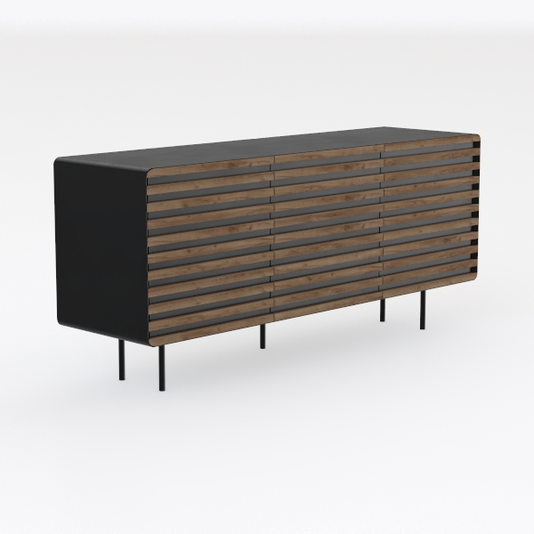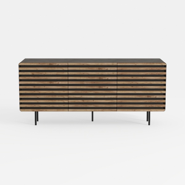 Design inspiration draws from the organic flow of natural wood grain and the crisp definition of geometric symmetry, weaving together warmth and modern minimalism. The surface showcases a striking pattern of alternating light and dark wood slats, creating a textural depth that shifts gently with light—soft, earthy, and inviting, with a subtle matte finish that highlights the material’s inherent beauty. Black metal legs add a sleek, contemporary contrast, lifting the piece to feel airy yet stable, while clean, unbroken lines keep the overall look uncluttered and refined.