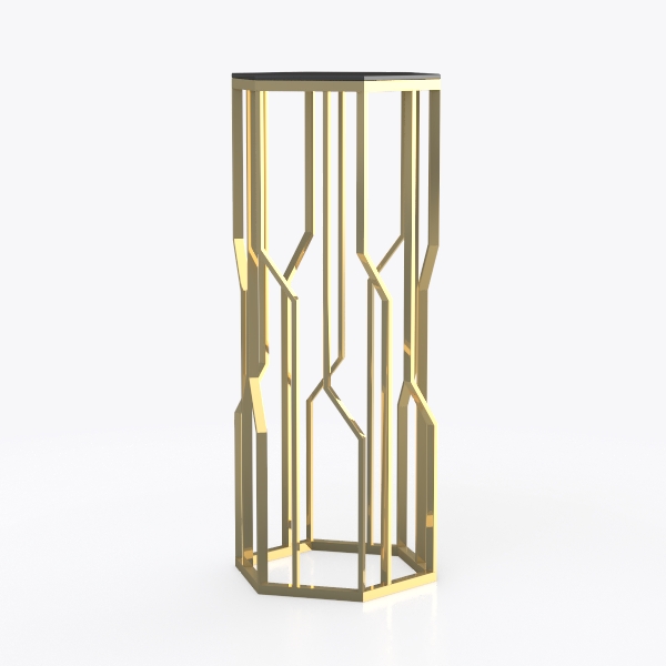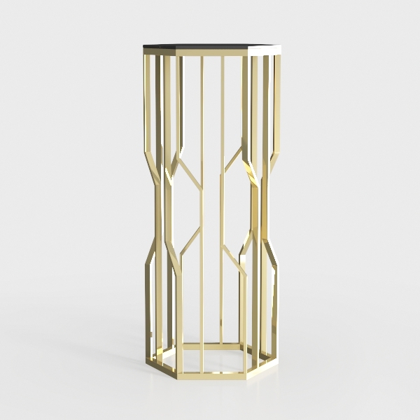 The openwork design, defined by intersecting angular lines that form a rhythmic lattice, infuses the structure with a sense of lightness, making it visually striking yet not overwhelming in small spaces. The hexagonal base, angled and stable, anchors the piece firmly, while the vertical lines stretch upward, creating a subtle height that commands attention without dominating the room.
