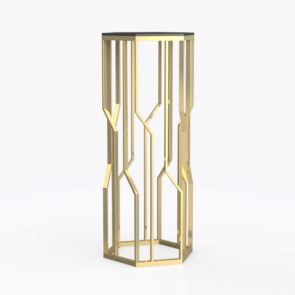 Crafted with a harmonious blend of architectural geometry and art deco elegance, this freestanding piece draws inspiration from the crisp lines of modernist architecture, reimagined through a contemporary lens. Its frame, forged from polished gold-tone metal, shimmers with a warm, luminous sheen, the smooth, cool surface offering a luxurious tactile contrast to the rich, dark expanse of the black marble top—its sleek, matte finish grounding the piece.