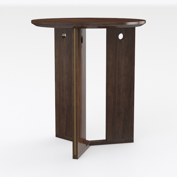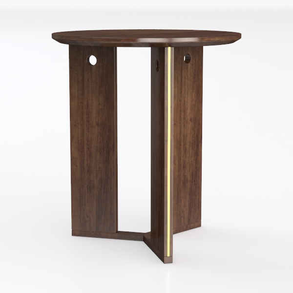 Visually, the piece commands attention through its thoughtful proportions: a smooth, round top of rich, dark wood curves gently, its surface polished to a subtle sheen that highlights the wood’s intricate grain—swirls and knots that tell the story of the tree from which it came. The vertical, split-leg design, with its two slim, parallel supports, creates a sense of airiness, while small, circular cutouts along the legs add a playful, almost sculptural detail, softening the solidity of the structure. Running your hand over its surface reveals a cool, refined texture—polished to a buttery smoothness, yet retaining the natural warmth of the wood, as if it has been gently kissed by time.