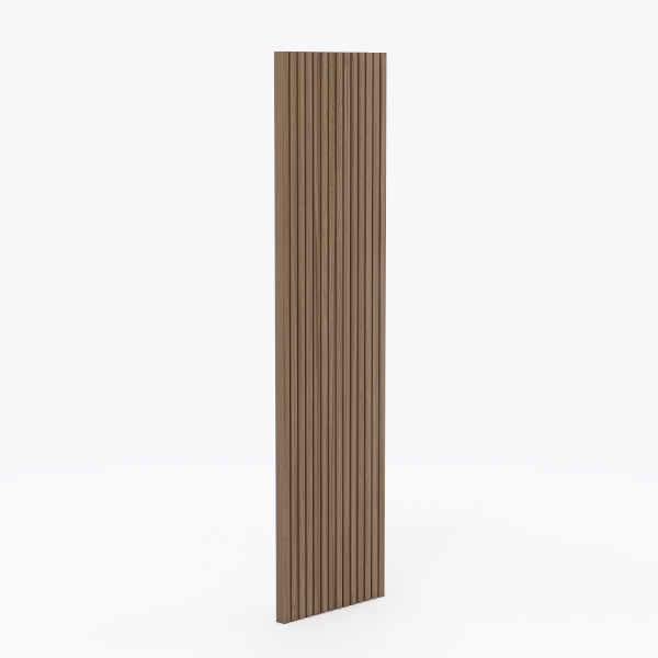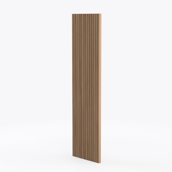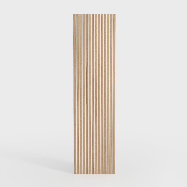 Crafted from light-oak wood, its surface reveals soft, visible grain patterns that catch the light, creating a warm, tactile texture. The vertical orientation elongates the space, while the consistent spacing between slats allows gentle light to filter through, casting delicate, shifting shadows that animate the surroundings. It feels smooth to the touch yet retains a natural, unpolished warmth, balancing modern minimalism with organic charm.