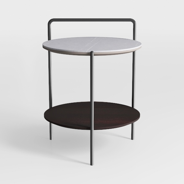 This elegant side table draws inspiration from the balance of organic textures and geometric precision, blending natural elements with modern design sensibilities. The top surface features a smooth, cool marble slab with delicate, flowing veining that catches light softly, while the lower shelf is crafted from warm, rich dark wood, its grain visible and tactile. The slender, matte black metal frame acts as both support and design element, creating a striking contrast between the light and dark materials.