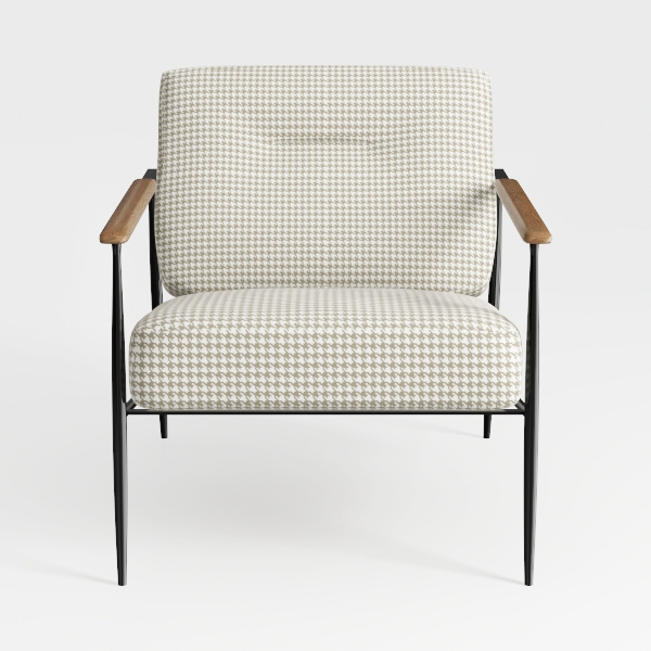 Functionality is key: the generously deep seat offers plush, supportive comfort, with a contoured backrest that cradles the body, ideal for lazy afternoons of reading or casual chats. The sturdy metal frame ensures stability, while the wooden armrests provide a practical surface for placing mugs or books, blending style and utility seamlessly. Every detail—from the houndstooth upholstery to the balanced mix of materials—works to create a piece that feels both timeless and fresh.