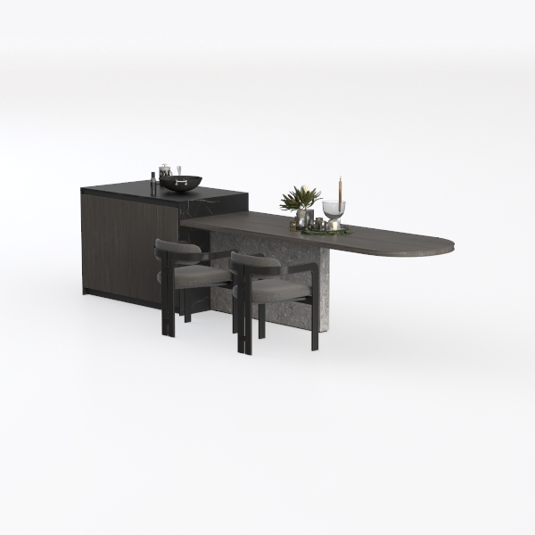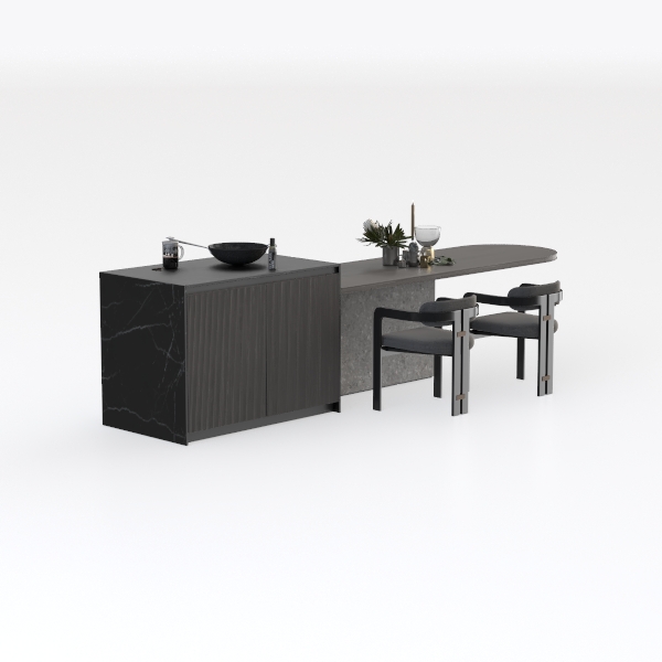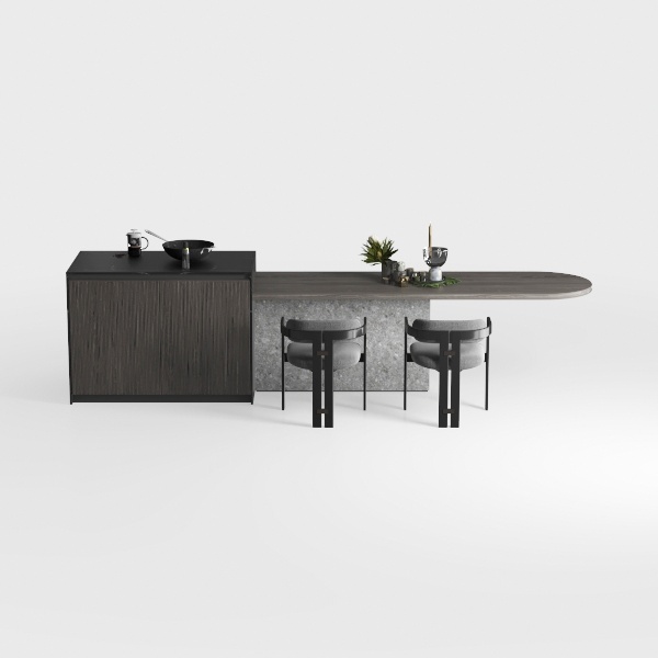 The left cabinet features a deep, dark wood-grained finish—its smooth surface reveals subtle, natural patterns that add warmth, while the central countertop, with its cool, matte gray stone-like texture, offers a tactile contrast: cool to the touch yet solid, with fine surface details mimicking the organic flow of stone formations. The bar stools, with plush gray upholstered seats and slim black metal legs, provide a soft, inviting seating experience, their structured design complementing the unit’s streamlined silhouette.