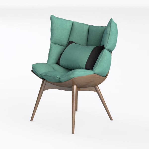 Visually, the chair balances softness and structure: the vibrant green fabric catches light beautifully, while the warm, matte wood legs—sleek, tapering to a delicate point—ground the piece, creating a harmonious blend of organic warmth and modern simplicity. Its proportions are carefully considered, neither too large nor too small, making it versatile for various spaces.