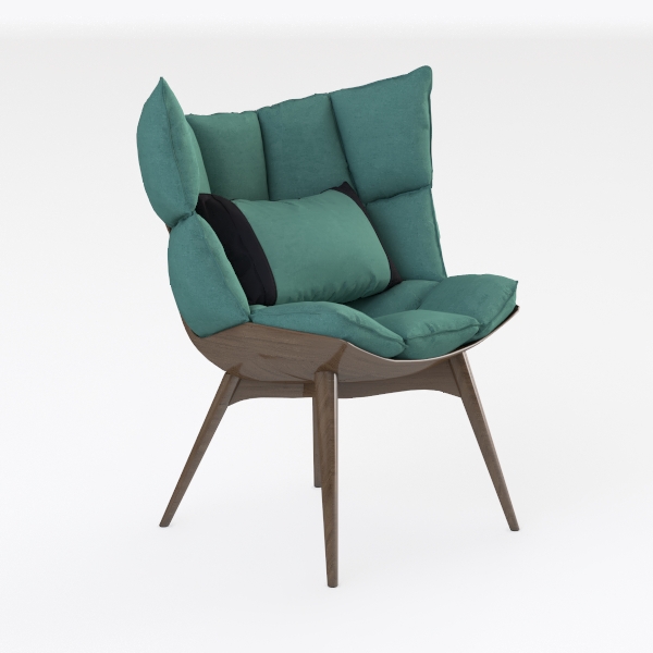 This piece takes cues from organic, flowing natural forms, with its softly rounded silhouette evoking the gentle curves of a seashell or the arch of a mature tree branch. The chair’s main feature is its sumptuous, emerald-green upholstery, crafted from a soft, breathable fabric that feels surprisingly substantial to the touch—plush yet not overly bulky, inviting both casual lounging and extended relaxation. Nestled against the curved backrest is a rectangular throw pillow, its deep green hue accented with thin black stripes, adding subtle contrast and intentional style.