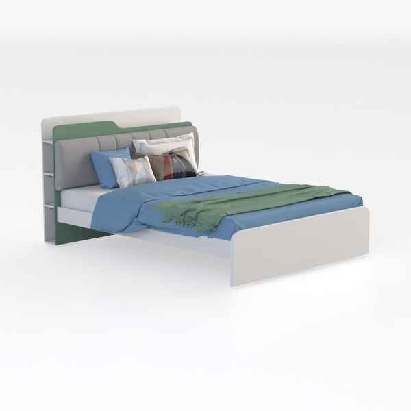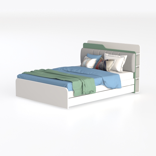 Inspired by the gentle interplay of natural calm and modern simplicity, this bedroom furniture piece radiates a serene, intentional charm. Its sleek, matte white frame embodies clean minimalism, while the headboard features a soft, textured gray upholstery with a delicate sage green accent strip—evoking the quiet beauty of understated nature. The crisp blue linen sheets drape softly, catching light to create a warm, airy feel, while a plush green throw blanket, with its subtle fuzzy texture, adds a tactile layer of comfort, inviting moments of relaxation.