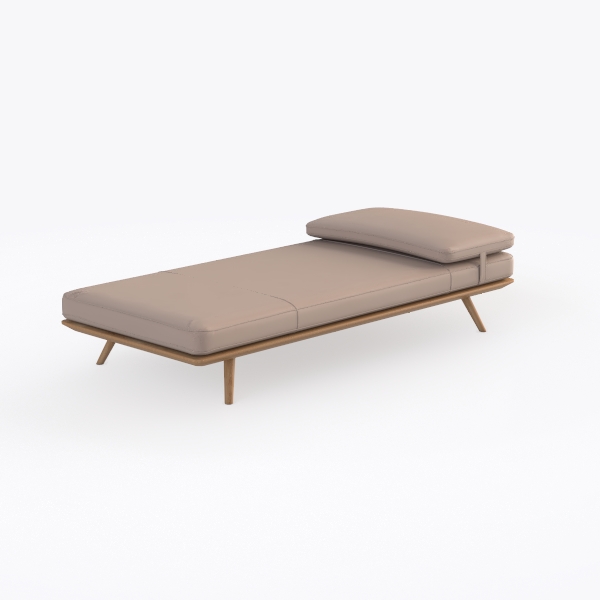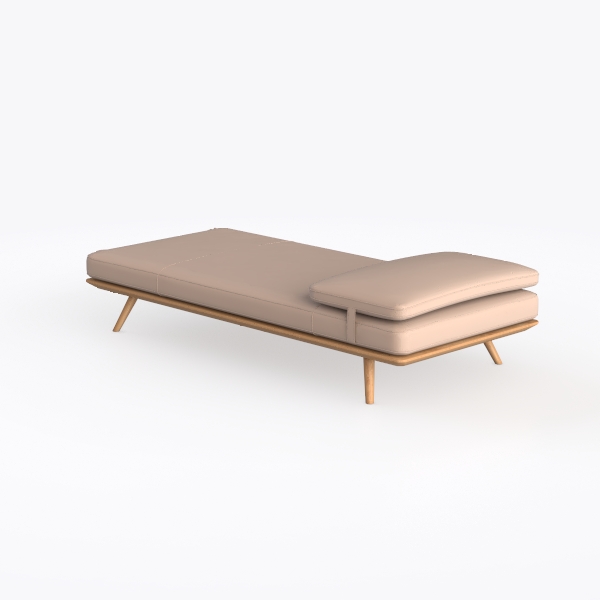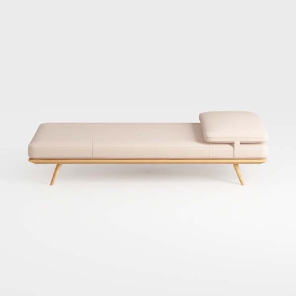 This elegant chaise lounge is inspired by minimalist design principles that seamlessly blend comfort and style. The soft, muted hue of the upholstery invites relaxation, while the smooth surface offers a luxurious tactile experience. The light-colored frame, crafted from natural wood, adds warmth and a touch of sophistication, creating a stunning contrast with the plush seating.