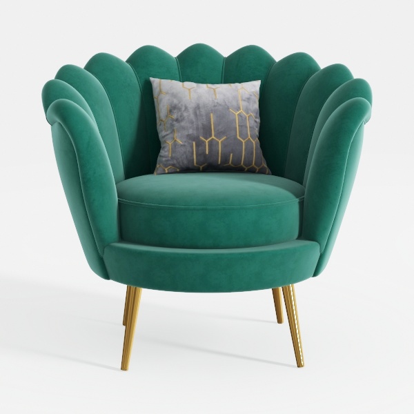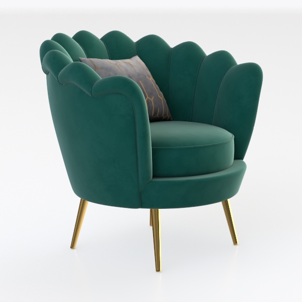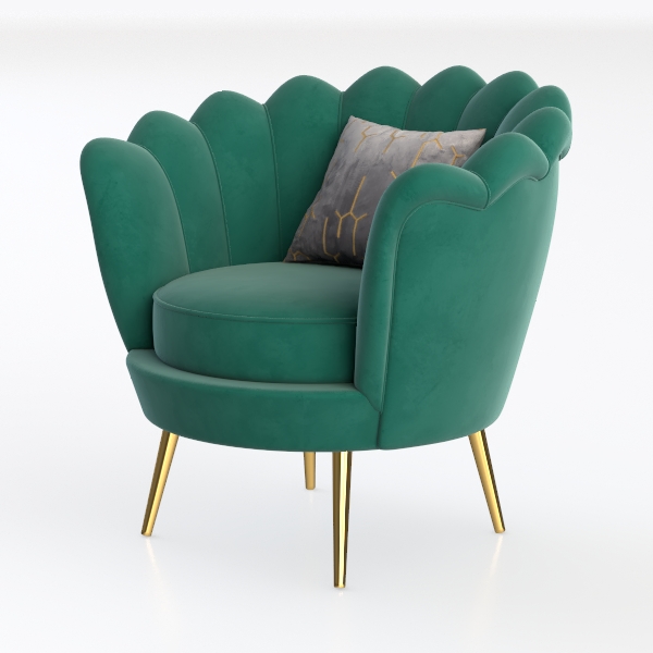This single-seater sofa chair embodies a design inspired by nature’s organic beauty, with its scalloped backrest curving outward like petals unfurling gently, evoking the soft, flowing movement of blooming flowers or elegant seashells. The deep emerald upholstery, crafted from a velvety, high-quality fabric, feels incredibly smooth and plush to the touch, while the rounded silhouette of the seat offers a generous, supportive depth that encourages relaxation.