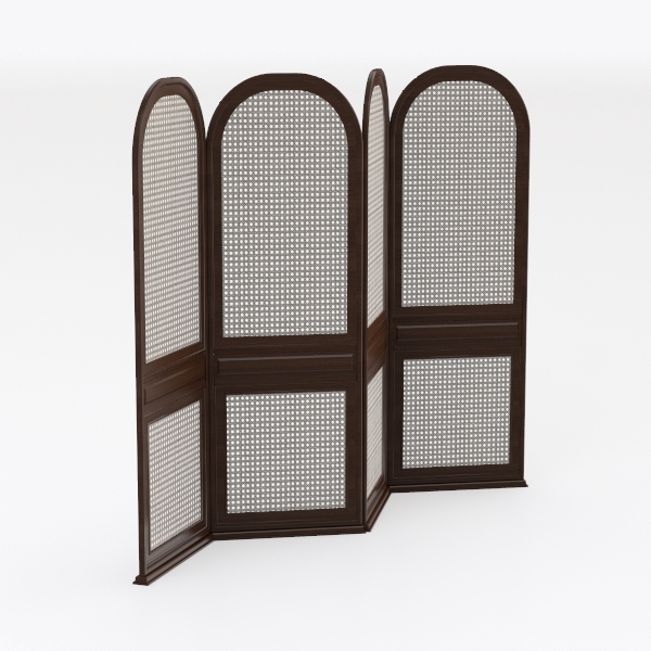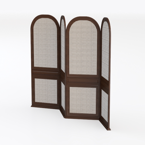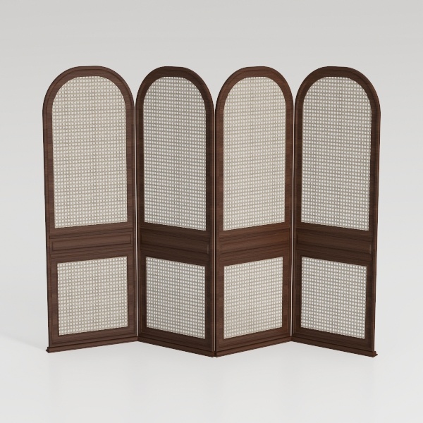 The room divider showcases a thoughtful blend of classic design and natural artisanal elements. Its four arched panels, connected by a foldable frame, create a balanced silhouette that feels both structured and open. The deep brown wooden framework, with its smooth, warm grain, offers a tactile, grounding presence, while the woven material in the upper and lower sections adds a light, airy texture—evoking the organic patterns of traditional wicker or rattan craftsmanship.