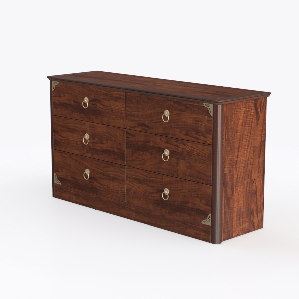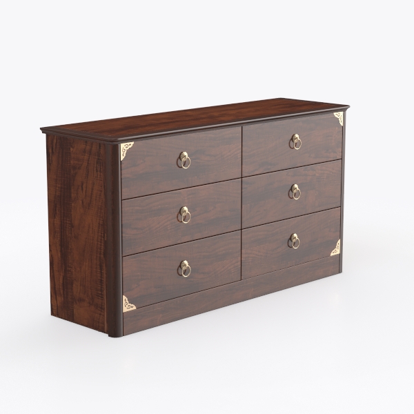 Drawing inspiration from timeless craftsmanship, this wooden dresser features warm, rich brown tones with intricate wood grain, complemented by elegant gold metal handles and corner accents. Its smooth surfaces and sturdy structure make it perfect for a classic or vintage bedroom, offering ample storage with six spacious drawers to organize cosmetics and accessories.