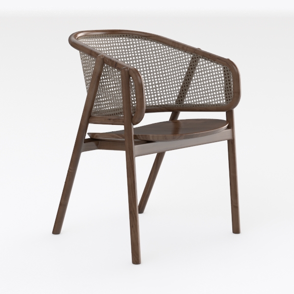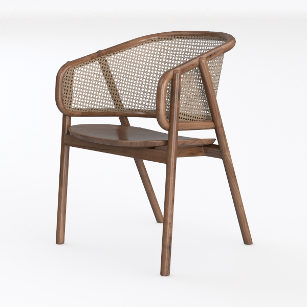 This piece draws inspiration from the seamless fusion of traditional craftsmanship and modern design principles, merging the durability of solid wood with the artisanal charm of woven materials. The warm, smooth walnut wood frame features soft, flowing curves that create an elegant silhouette, its natural grain adding depth and a tactile richness—gentle to the touch, with a subtle luster that catches light. The backrest, woven from light, airy rattan, offers a textural contrast: lightweight yet sturdy, it allows for breathability while casting delicate shadows, balancing the wood’s solidity with a sense of lightness.