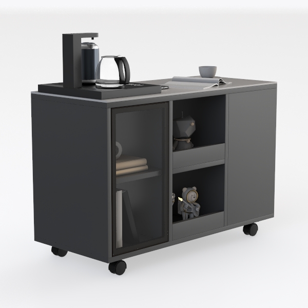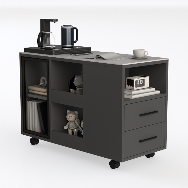 Equipped with four smooth-rolling casters, it offers effortless mobility to reposition as needed—whether to rearrange the room’s layout or roll it aside for cleaning. Below the countertop, a mix of storage zones caters to daily needs: closed shelves tuck away mugs and small appliances, while the glass-fronted section showcases cherished keepsakes, and the lower cubbies cradle playful decorative figures, adding a personal, lived-in feel. Every detail merges practicality with personality, making it a thoughtful addition to spaces where form and function coexist harmoniously.